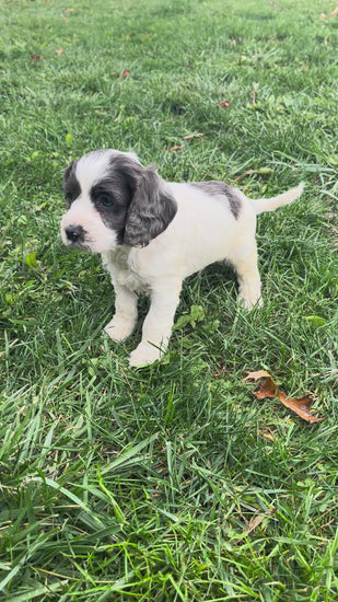 His mama is a chocolate and white Cocker Spaniel and daddy is a gray Mini Poodle.