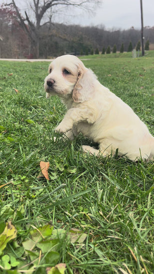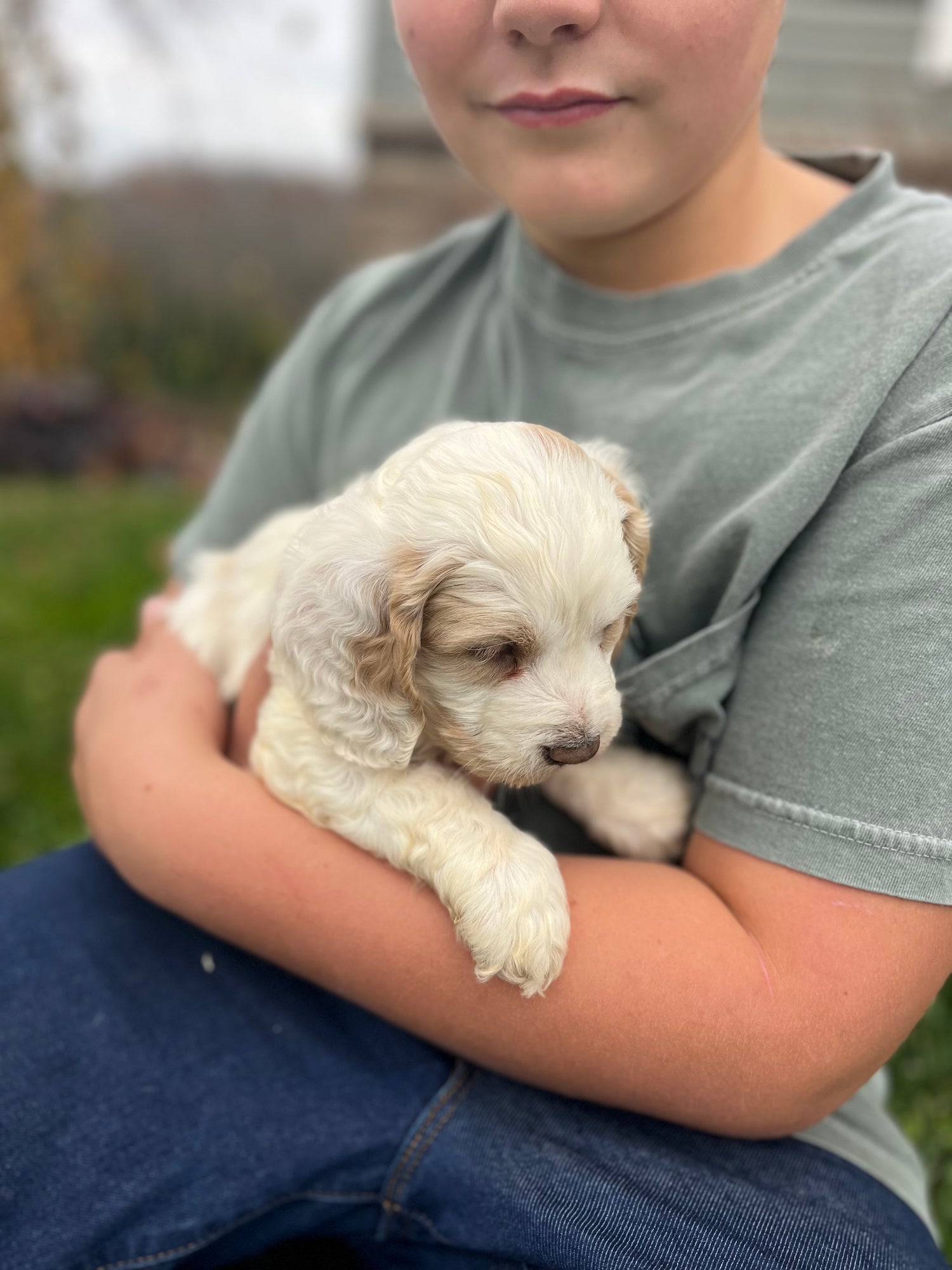 His mama is a chocolate and white Cocker Spaniel and daddy is a gray Mini Poodle.
