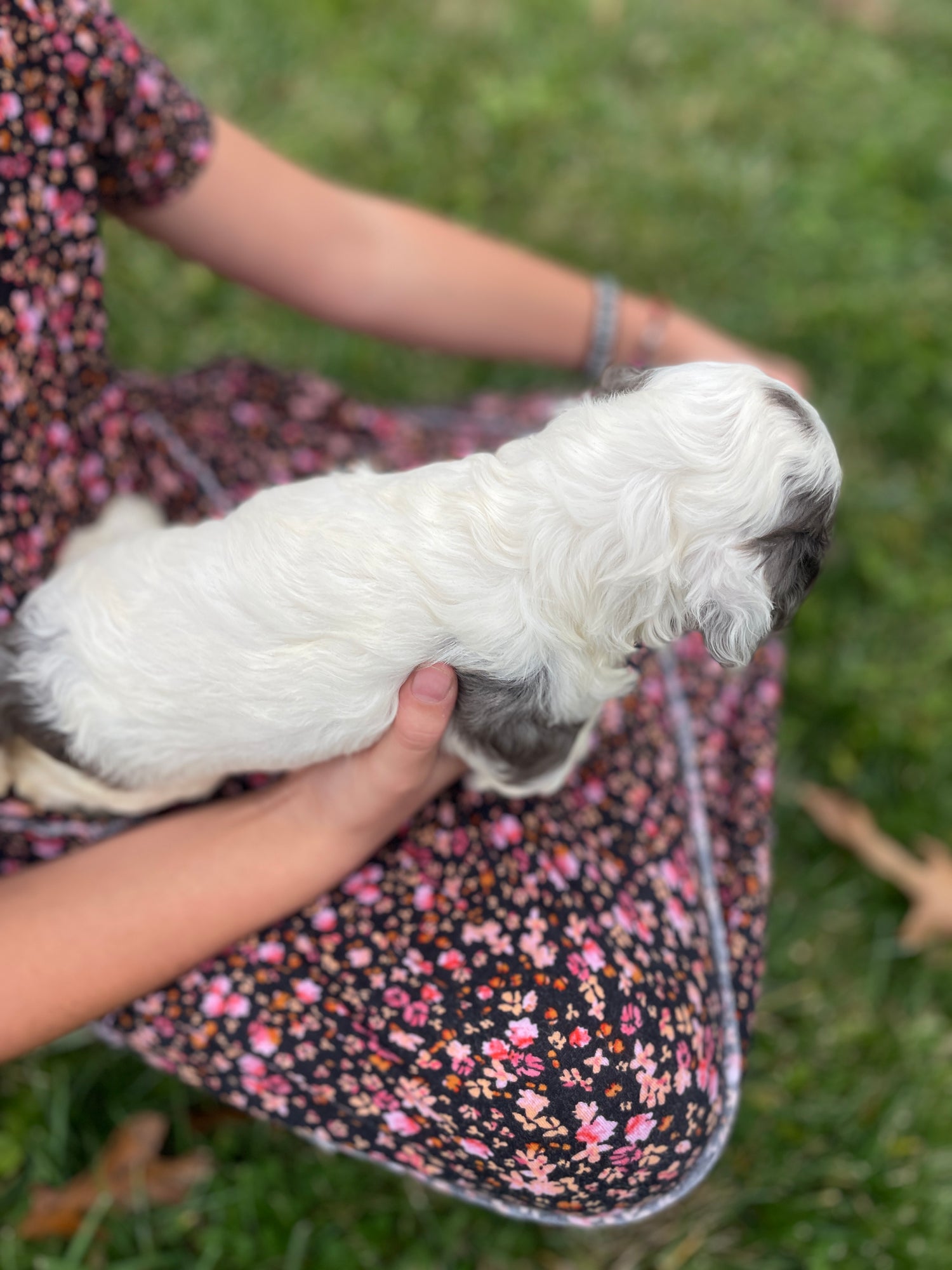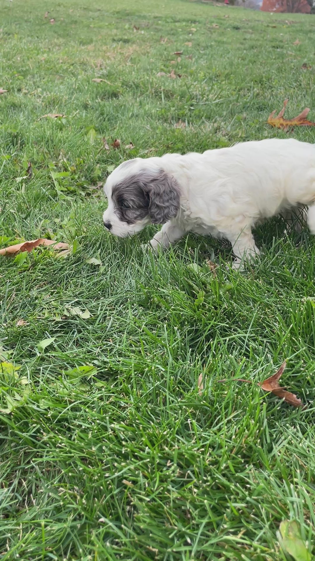 Her mama is a chocolate and white Cocker Spaniel and daddy is a gray Mini Poodle.